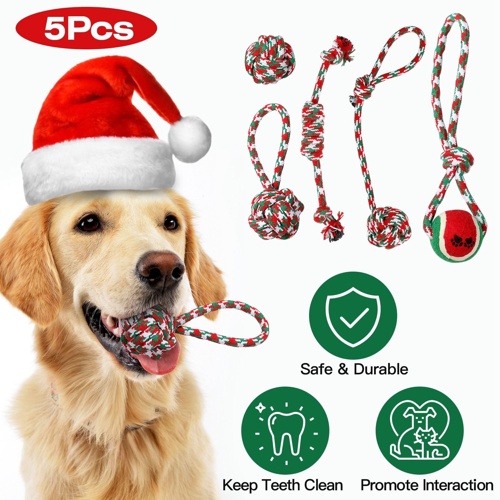 *Christmas Theme*:This 5Pcs chew toys set features a red,green and white color scheme designed with rope,knot and ball,which are full of joyful and festive atmosphere to spend an interesting Christmas with your dog.