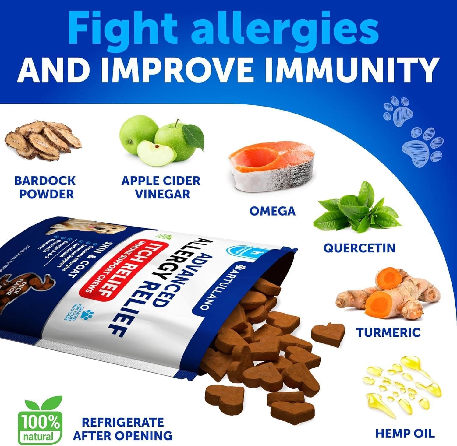 1.allergy support for dogs: itchy skin, swollen eyes, runny nose - these are signs of dogs' seasonal allergies. our anti itch for dogs chews contain a blend of ingredients to support a normal histamine response to external stimuli.